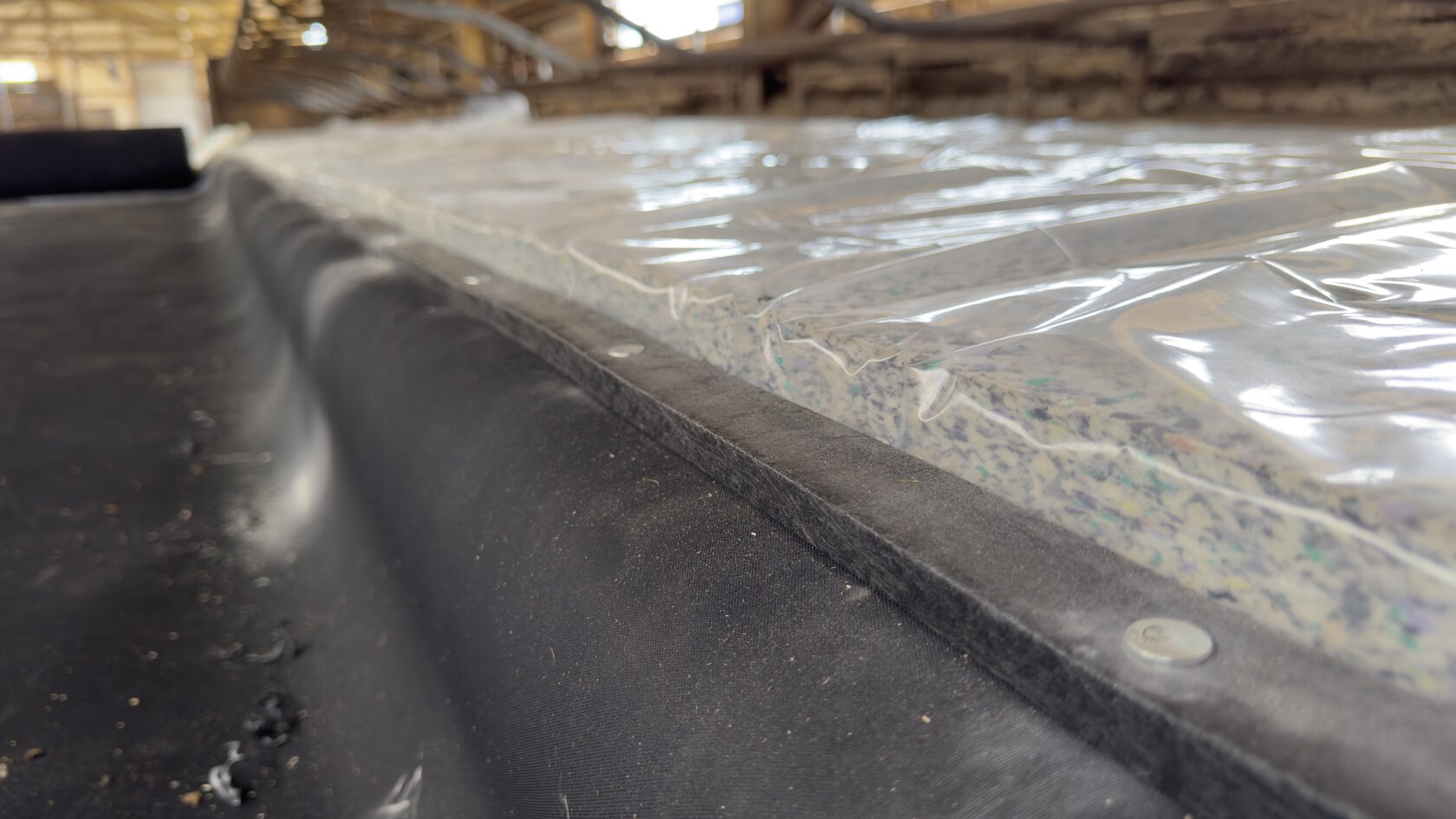 Верхний слой матраса выполнен из резины NR+SBR толщиной 4 мм. Она обладает высокой прочностью, эластичностью и устойчивостью к низким температурам. Для дополнительной защиты от механических повреждений и износа, покрытие усилено тканевым кордом.