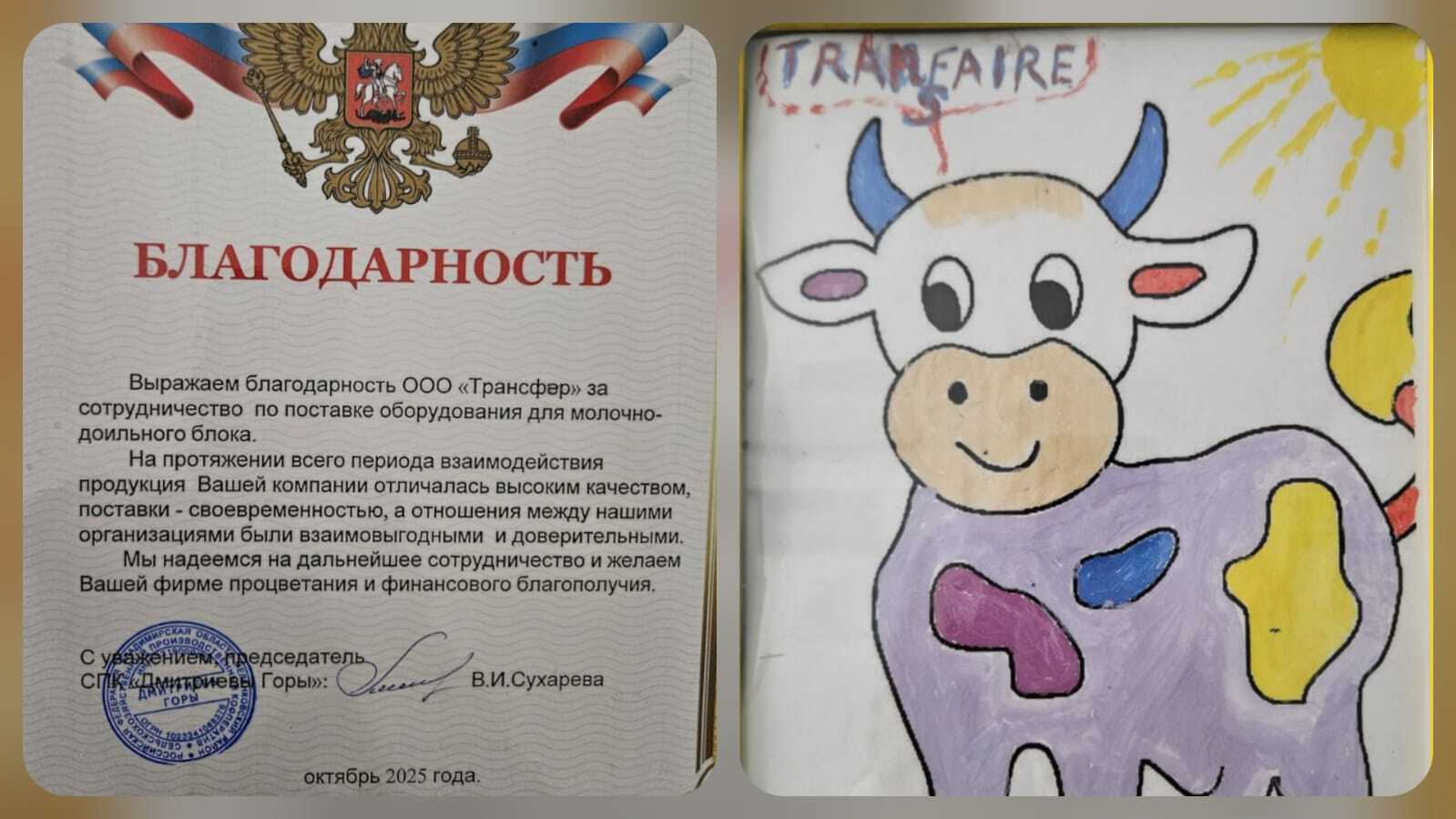 Вклад компании Transfaire в запуск нового доильно-молочного блока хозяйства был отмечен благодарственной грамотой.