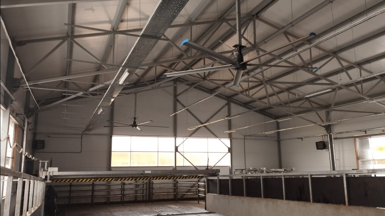 Воздухообмен в доильно-молочном блоке будет осуществляться с помощью вытяжных шахт, горизонтальных и разгонных вентиляторов Mousson, а также надувных мембранных штор ISOCELL, управляемых с помощью контроллера и температурных датчиков.
